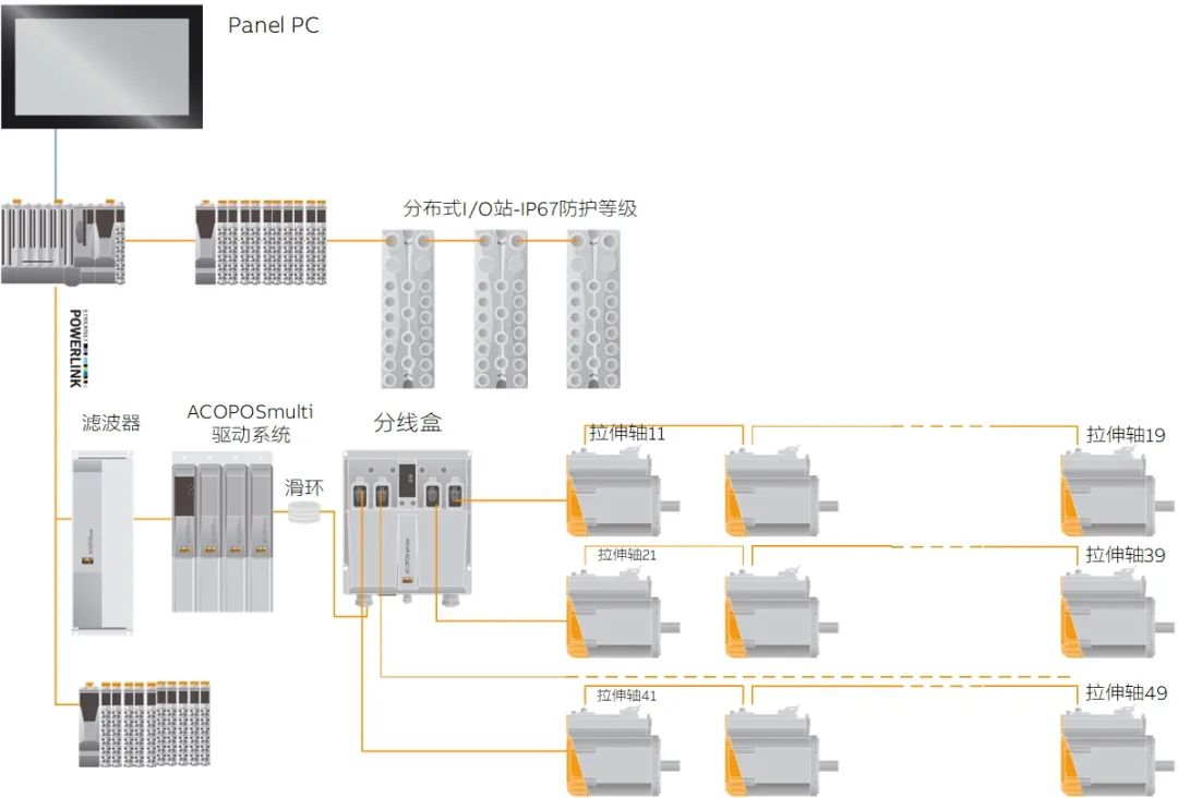 整個貝加萊旋轉(zhuǎn)吹瓶系統(tǒng)的架構(gòu)如圖5所示,通過POWERLINK網(wǎng)絡(luò),達(dá)到百微秒級的任務(wù)刷新,ACOPOSmotor、X67的模塊均可在現(xiàn)場安裝,并達(dá)到IP65防護(hù)等級,適合于啤酒飲料等生產(chǎn)現(xiàn)場,并且,ACOPOSmotor還支持“單電纜技術(shù)”—接線方便且成本低。
